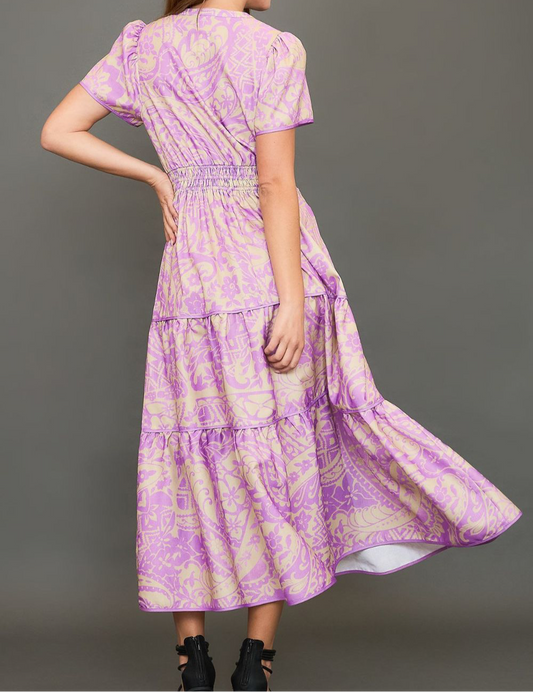Umgee Full Size Printed Notched Short Sleeve Tiered Dress Plus Size