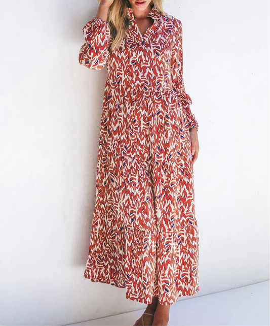 Printed Johnny Collar Long Sleeve Midi Dress