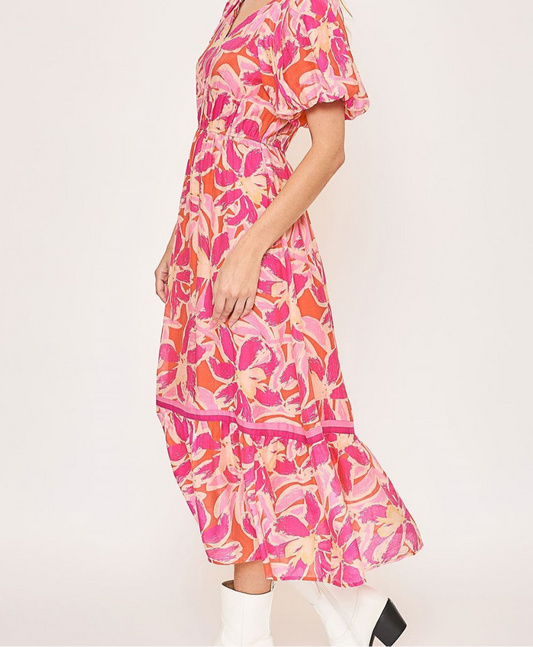 Umgee Floral Notched Puff Sleeve Midi Dress