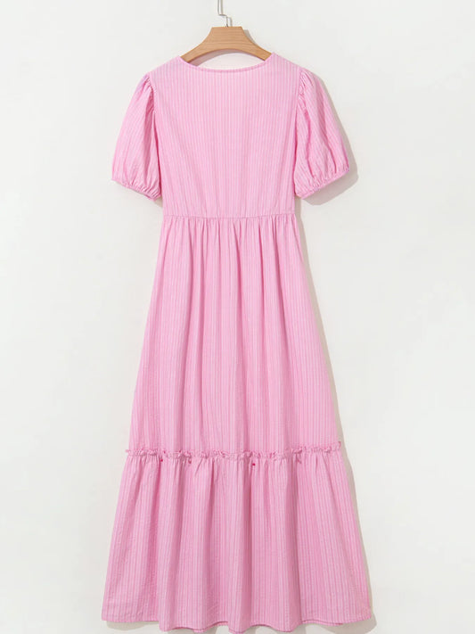 Striped Puff Sleeve V-Neck Maxi Dress