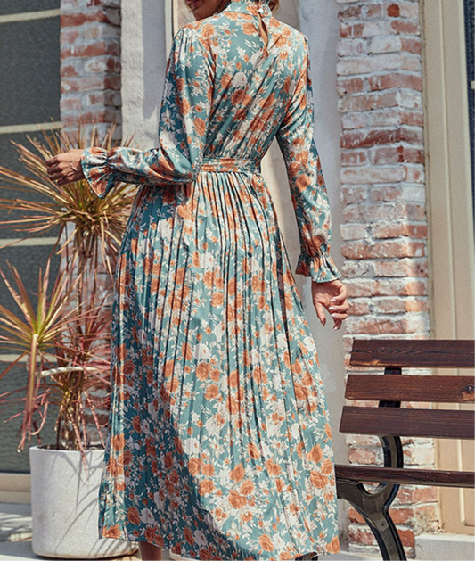 Perfee Tied Pleated Printed Mock Neck Long Sleeve Dress
