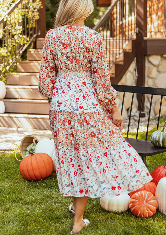 Full Size Printed V-Neck Lantern Sleeve Midi Dress
