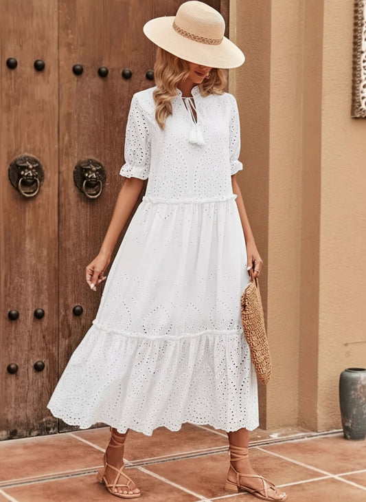 Eyelet Tie Neck Half Sleeve Midi Dress
