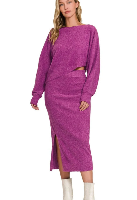 Zenana Ribbed Asymmetric Hem and Sleeve Top & Skirt Set