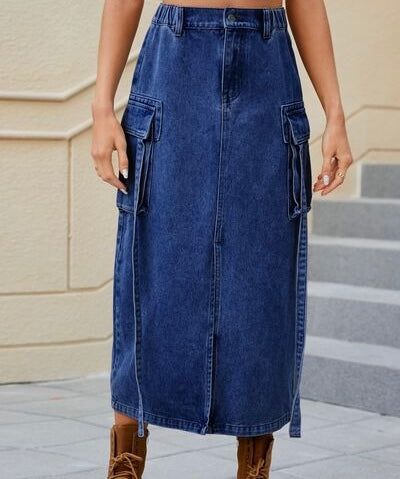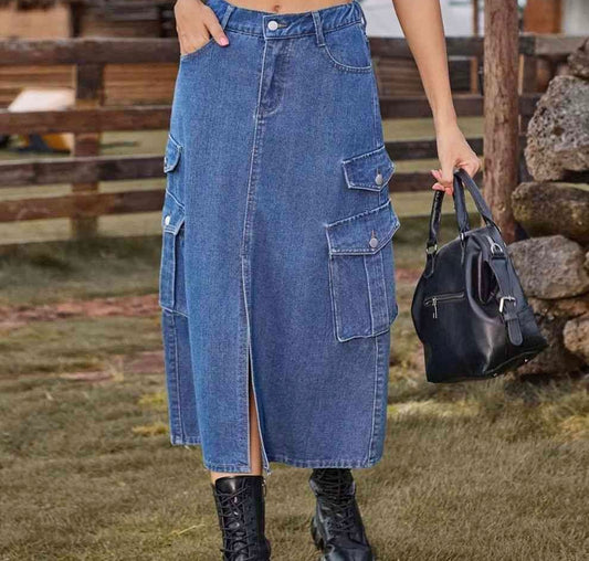 Slit Pocketed High Waist Denim Skirt