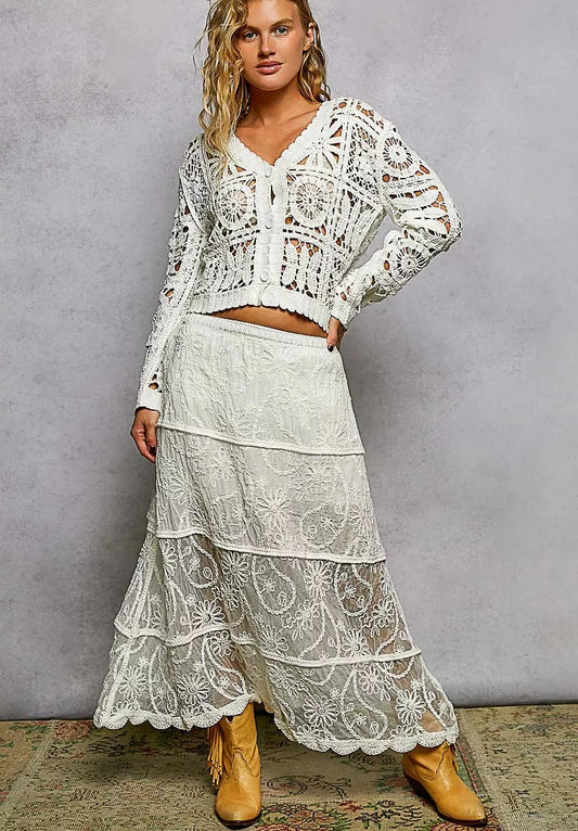 POL Button Down V-Neck Long Sleeve Cropped Crochet Cardigan