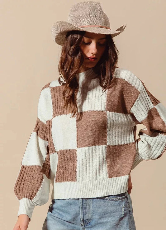 SO ME Ribbed Color Block Checkered Plaid Sweater