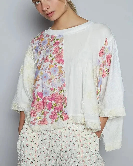 POL Floral Lace Patch Round Neck Double Gauze Top