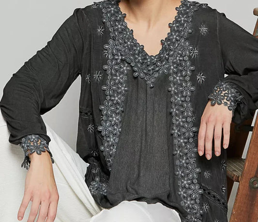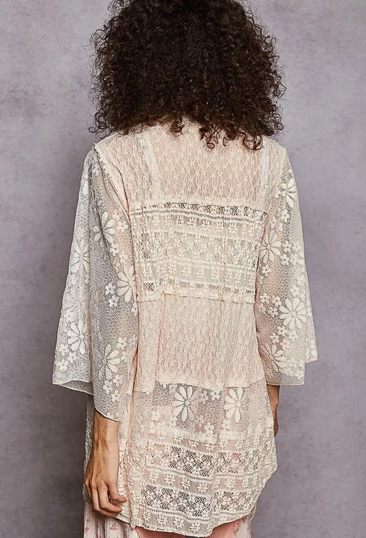 POL Lace Floral Open Front Cardigan with Trim Detail
