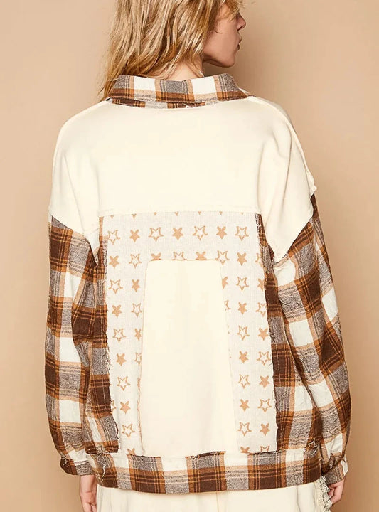 POL Plaid & Star Patchwork Contrast Long Sleeve Shacket