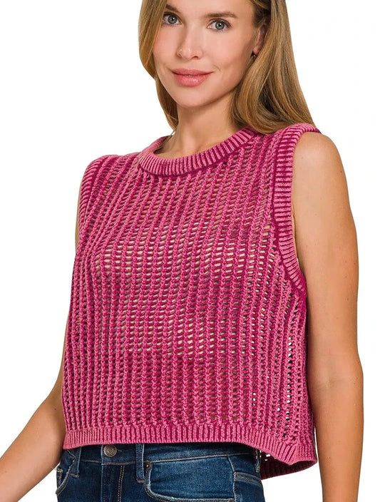 Zenana Acid Washed Fishnet Sweater Vest Overlay