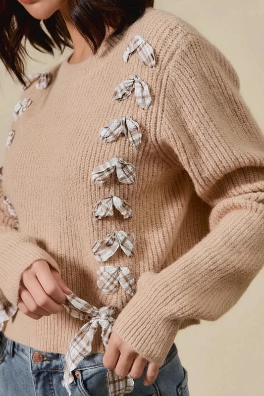SO ME Checkered Plaid Tape Lace Up Ribbed Sweater