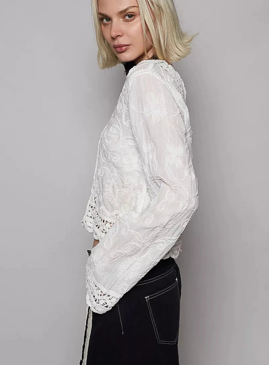 POL Long Sleeve Cropped Crochet Top with Floral Embroidery Detail