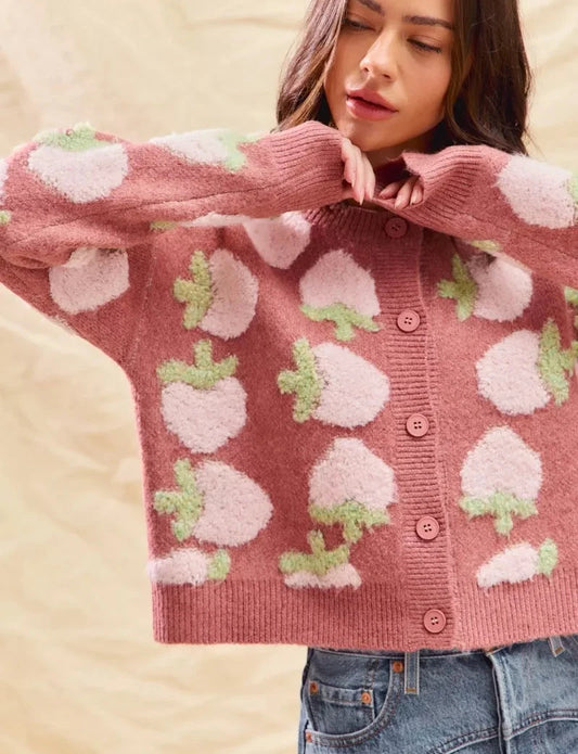 SO ME Strawberry Fruit All Over Button Sweater Cardigan