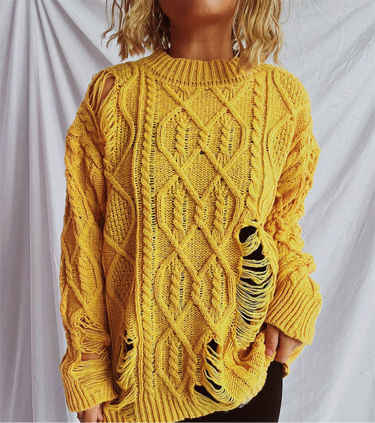 Distressed Cable-Knit Round Neck Long Sleeve Sweater