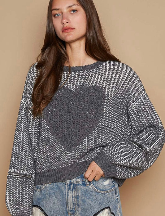 POL Round Neck Heart Patch Zipper Point Sleeve Sweater