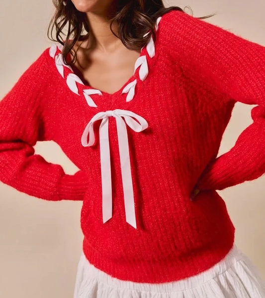 SO ME Satin Tape Braided Ribbon Tie V Neck Sweater
