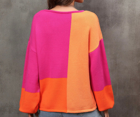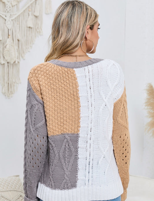 Cable-Knit Openwork Round Neck Color Block Sweater