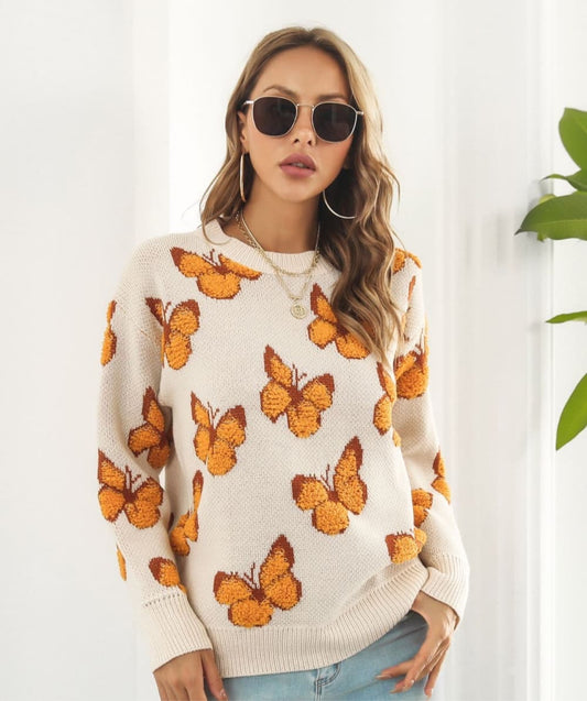 Butterfly Pattern Round Neck Dropped Shoulder Sweater