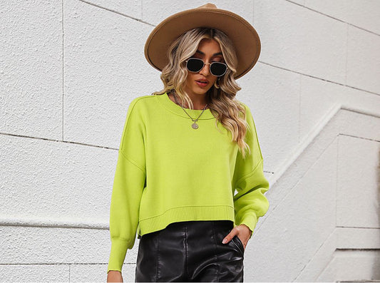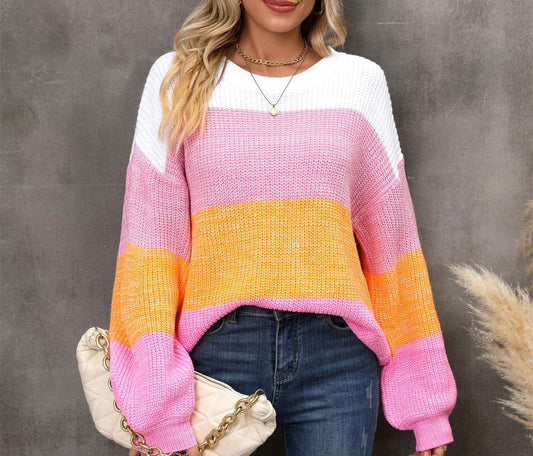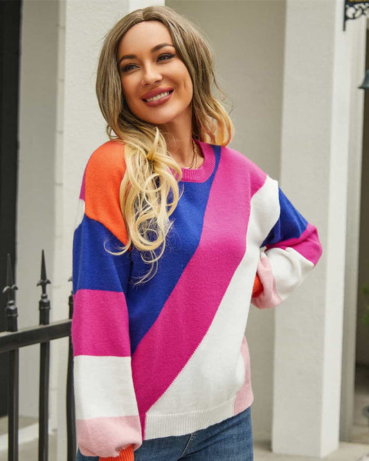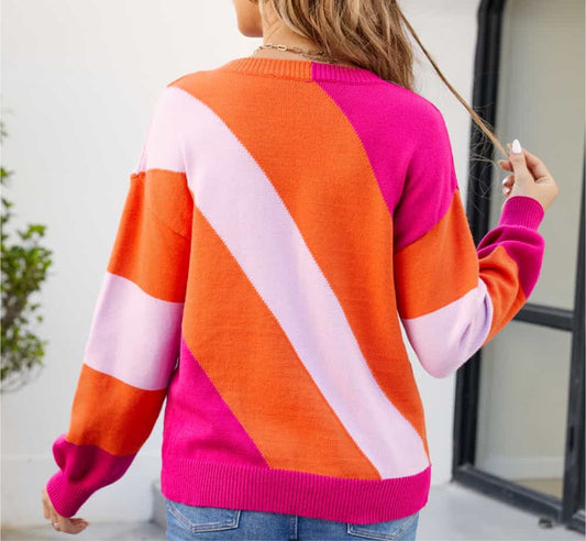 Round Neck Contrast Color Dropped Shoulder Sweater