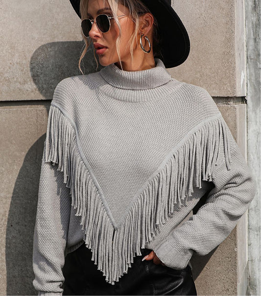 Turtle Neck Tassel Front Long Sleeve Pullover Sweater