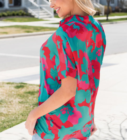 Printed Johnny Collar Short Sleeve Top